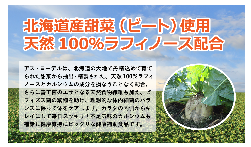 ほんのりと甘い味がする植物性オリゴ糖として知られています。ビート(甜菜)は、秋の収穫時期に気温が低くなると、凍結から身を守るため細胞内にラフィノースを蓄え始めます。きびしい自然環境の中で生まれた不思議なオリゴ糖です。ラフィノースはお砂糖ではありません。オリゴ糖は難消化性なので、体の奥までしっかり届いて善玉ビフィズス菌を増やします。